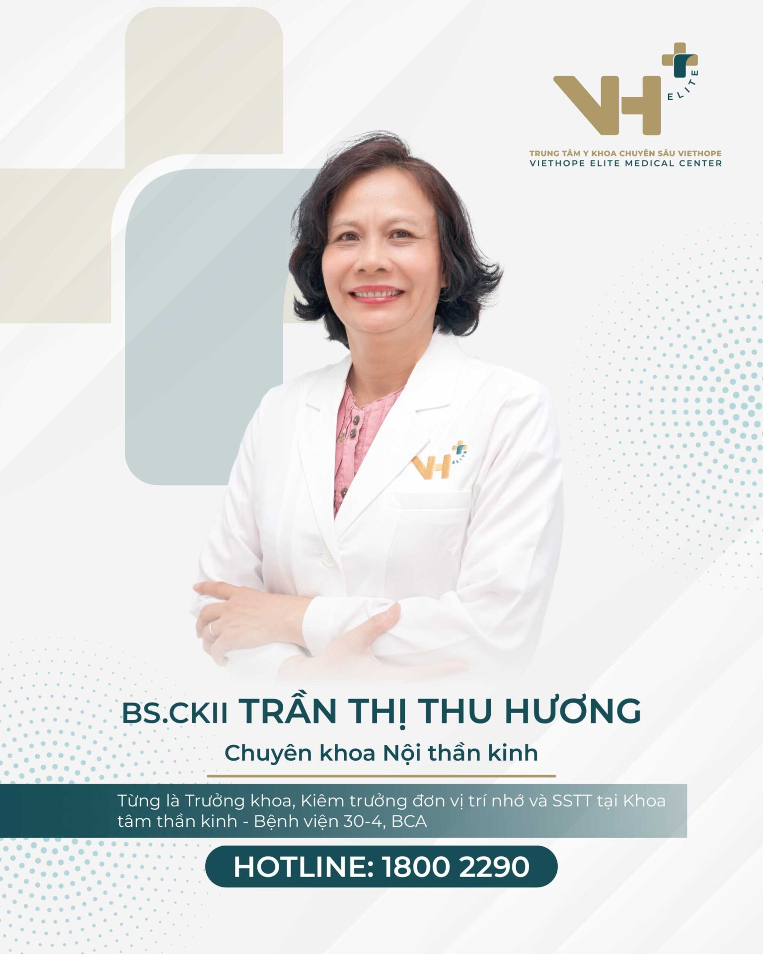 BS. CKII Trần Thị Thu Hương là một chuyên gia uy tín trong lĩnh vực Nội Thần kinh, đặc biệt là nghiên cứu và điều trị sa sút trí tuệ. Với tư duy học thuật sắc bén, bác sĩ đã có nhiều đóng góp quan trọng trong các công trình nghiên cứu quốc tế và giữ vai trò lãnh đạo chủ chốt tại các đơn vị thần kinh chuyên sâu.